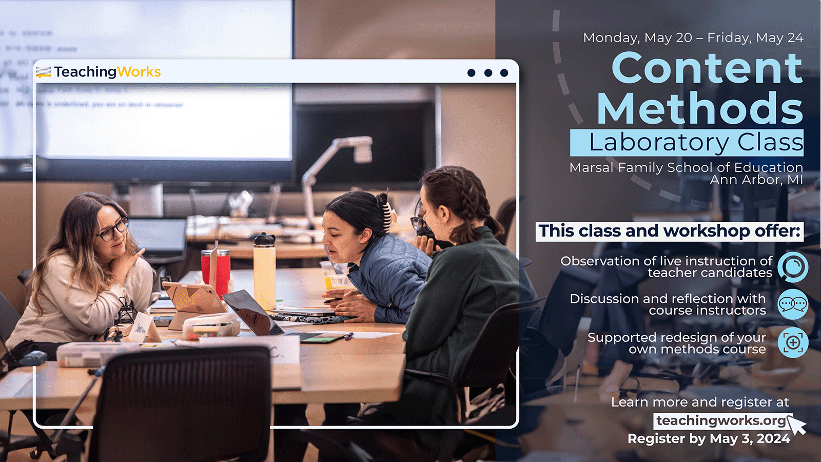 As the centerpiece of the 2024 TeachingWorks Content Methods Laboratory Class and Workshop, Deborah Loewenberg Ball will teach a mathematics methods course to teacher candidates while teacher educators from around the country watch in person or virtually. Loewenberg Ball will introduce problems of practice for consideration in each daily pre- and post-class discussion and will also invite participants to raise their own questions and ideas. This will allow participating teacher educators to investigate the best ways to use a semester-long methods course and engage in rich conversations about the design of practice-based courses, including what to include in a one-semester course. The methods laboratory class is designed to support the learning of all involved, particularly of the participating teacher candidates, but also of participating teacher educators and the laboratory class instructors.